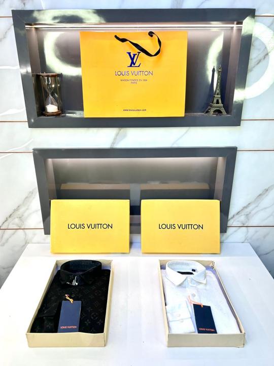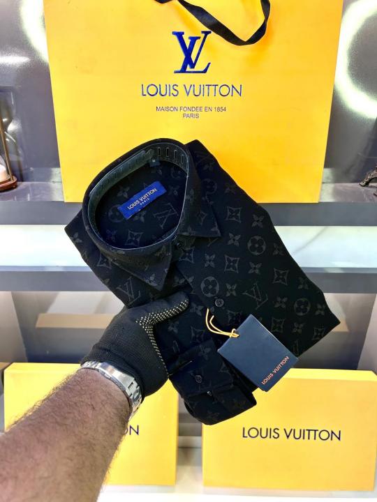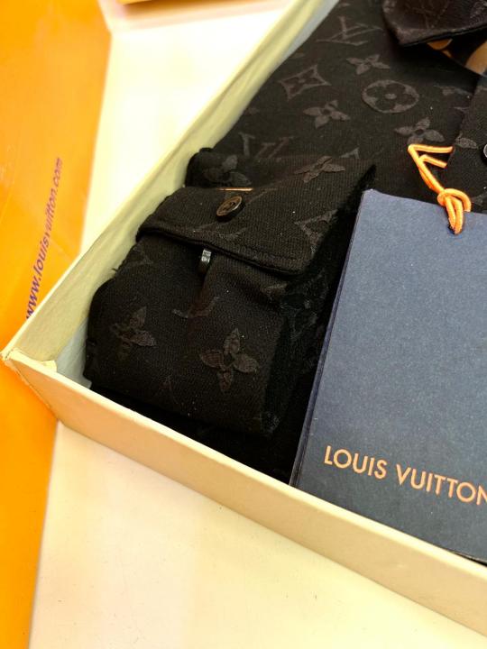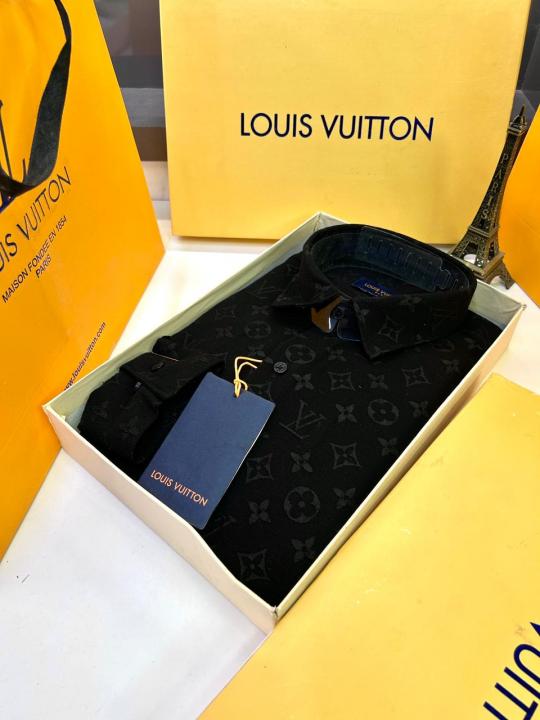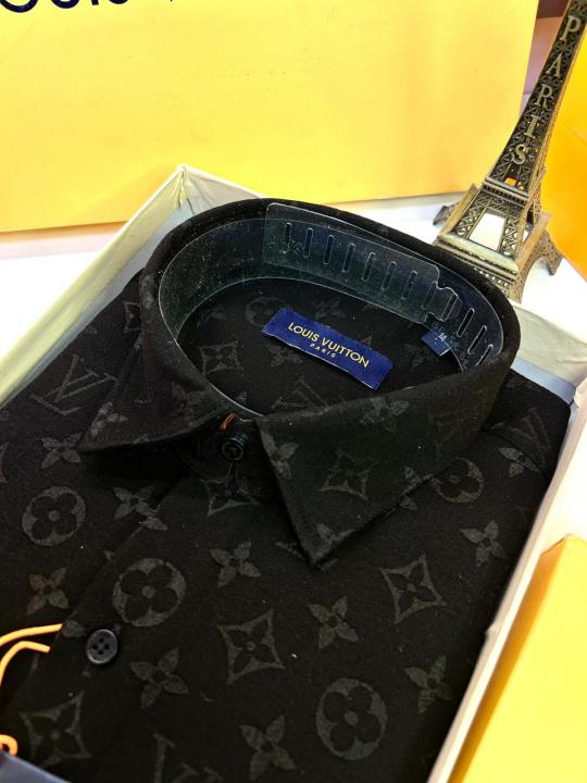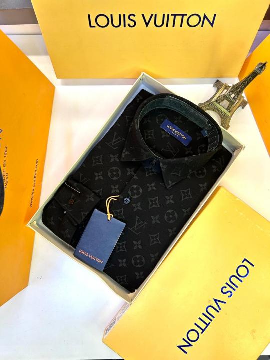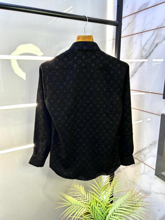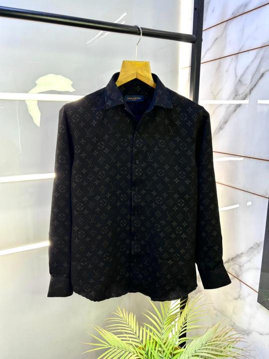 Home Shirts Louis_Vuitton Monogram Allover Print Premium Black Shirt With Brand Box Packing and Carry bag F3139-BL